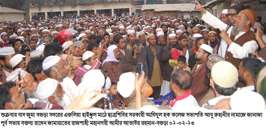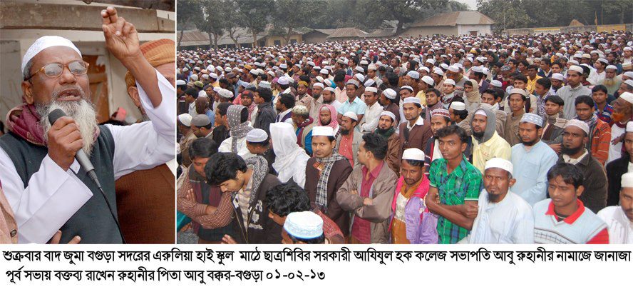 Further inflaming the situation, police did not give permission to hold the predeclared namaaz-e-janaza for the martyrs. So, the first namaaz-e-janaza in absentia was performed at the city central High School ground after Jumu’ah prayers led by Bogura district Jamaat Naib-e-Amir and Kahalu Upazila ChairmanMaulana Taib Ali. Quoting witnesses, Naya Diganta reports an attendance of more than 30,000 people at this namaaz-e-janaza in absentia. Later, thousands of people attended the second namaaz-e-janaza of Abu Ruhani at the local school ground of his village home at Mondolpara of Arulia at Shohortoli in Bogra. Jamaat worker Mizanur Rahman was buried at his locality of Uttar Manik Nagar in Titas Upazila of Comilla and another Shibir leader Abdullah Al Mamun was buried at his own village of Adarshapara, in Kalai upazila of Joypurhat. Justice was called for the martyrs by speakers and attendees alike.