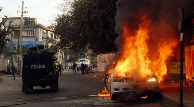 | A car burns as police violently disperse a BNP procession at Dhaka. Reports say that Jubo Dol President Muazzem Alal was bullet ridden in the clashes |