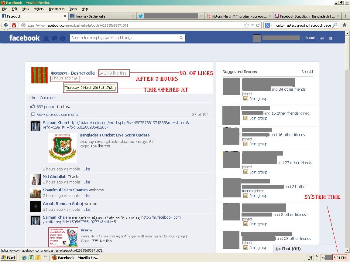 A little investigation gave the following details. The page was opened at 17:21 pm local BD Time. Around an hour later it had more than 7000 likes. Exactly after 2 hours it had 17500 plus likes. At 2 hours 40 minutes, the facebook followers crossed 22000. At exactly three hours, the number of followers was at 24, 079.