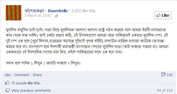 “In this subcontinent, if we [Bangladesh] and Pakistan unite, we won’t have to care about Malaun [Hindu], atheist and Nasara [Christian],” says a Facebook post of Basher Kella posted on Sunday.