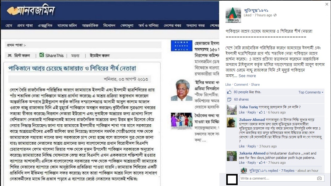 The news item says that more than 500 senior leaders Jamaat and Shibir leaders have applied for asylum in Pakistan. A ridiculous post of epic proportions, the article claims that Abul Kalam Azad (who was given the death penalty earlier) was currently in Pakistan actively processing these asylum applications and that Taliban clans were pressing the government of Pakistan to accept the asylum applications of the Jamaat-Shibir leaders. The article further claimed that two advisors of Opposition leader Khaleda Zia had asked the Pakistani government to process the applications.