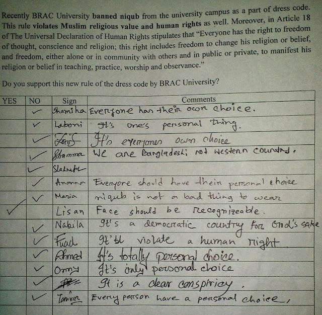 When this issue was first raised by BRAC University, a group of students were extremely supportive towards the students who were subject to this episode of inexplicable institutionalized harassment due to them wearing the niqab. So, they started a campaign in protest. Almost 1100 students of BRAC supported the cause through signature campaigns. Sadly, their support was discouraged by BRAC University authorities.