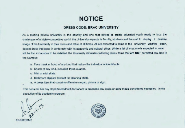 It is mentionable that BRAC University advises its students to comply with a dress code conforming to ‘its’ cultural and academic ethos and stipulates its students not to wear: