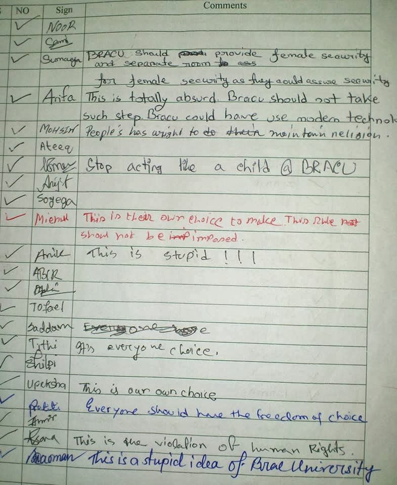 When this issue was first raised by BRAC University, a group of students were extremely supportive towards the students who were subject to this episode of inexplicable institutionalized harassment due to them wearing the niqab. So, they started a campaign in protest. Almost 1100 students of BRAC supported the cause through signature campaigns. Sadly, their support was discouraged by BRAC University authorities.