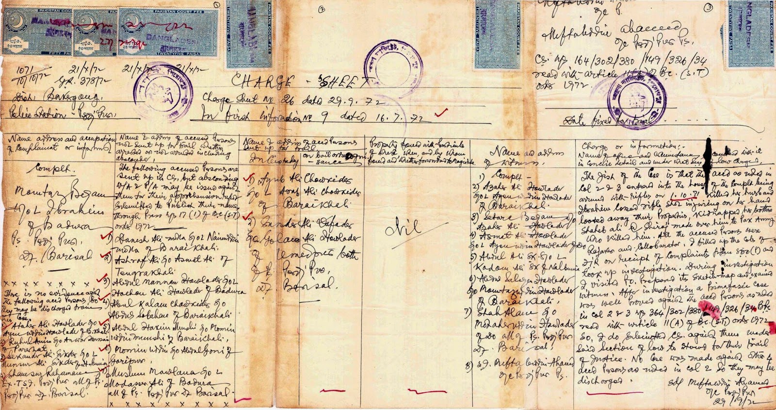 The Defence appealed Charge 8 on the grounds that the Tribunal failed to consider an important piece of exculpatory evidence, tendered by the Defence during trial, that lends strong support to Sayedee’s contention that he did not commit the crime alleged. This contention is supported by evidence that was disregarded by both the Tribunal and the Supreme Court. This evidence is a certified copy of the initial complaint lodged by Momtaz Begum, the widow of the victim, Ibrahim Kutti, and a certified copy of the charge sheet. This demonstrates that she lodged a petition of complaint before the relevant court in Pirojpur on 8 March 1972. The complaint, in which it is alleged that soldiers of the Pakistani Army and twelve named individuals who were cooperating with the army were responsible for the murder of Ibrahim Kutti, was filed with the Pirojpur Police Station on 16 July 1972. There was even evidence adduced that the Pirojpur police at the time recorded the same in its records as Case No. 9 and on 1 July 1972, it is apparent that the police sent the file to the Court in Pirojpur where it was entered into the court records. Those records were also entered as evidence during the trial.