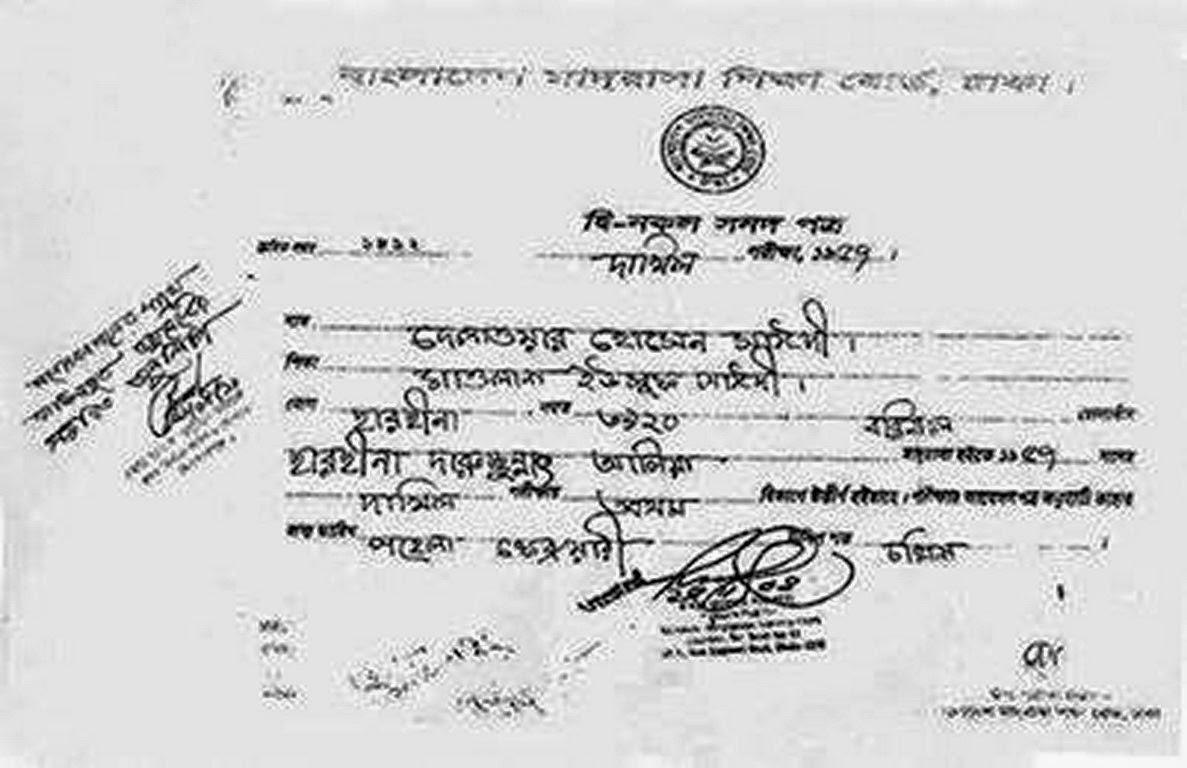 The Dakhil certificate of Maulana Delwar Hossain Sayeedi, dated 1957 states that he passed his Dakhil examination from Sarsina Darus Sunnah Alia Madrasah situated in Shorupkathi in Pirojpur. The certificate states his name as “Delwar Hossain Sayeedi, son of Maulana Yousuf Sayeedi”