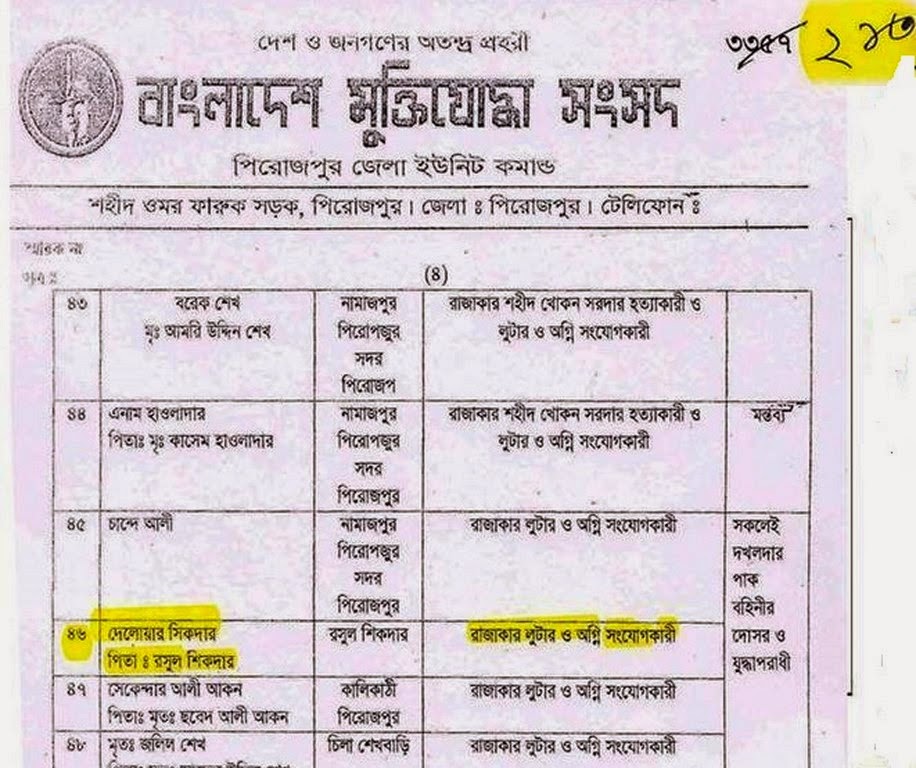 Below is given the list compiled by the Pirojpur District unit command of the freedom fighters association, wherein the 46th entry on the list is Delwar alias “Delu” Sikder, son of Rasul Sikder. He is listed as a known collaborator associated with looting and arson during the period of 1971.