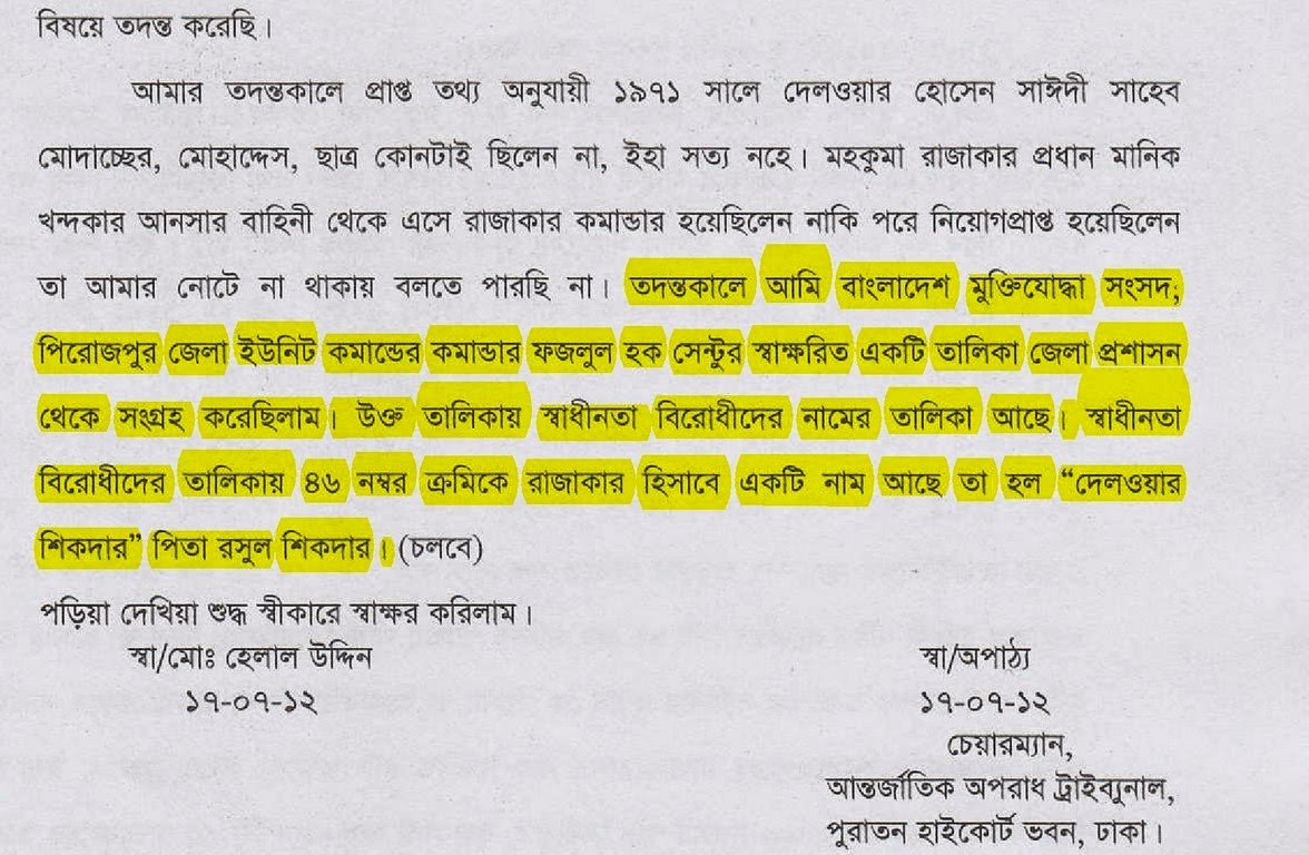 As per the document produced in front of the court, the investigating officer at the tribunal, Helal Uddin, on being questioned by the defence, admitted to the presence of a collaborator named “Delwar Sikder”. The defence lawyer Mizanul Islam on 18th July 2012 , asked Helal Uddin whether there was any collaborator in 1971 named “Delwar Sikder”, son of Rasul Sikder, on a list compiled by the freedom fighters of Pirojpur. Helal Uddin answered yes. This is the copy of the document submitted to the court by the investigating officer on his investigations regarding the matter.